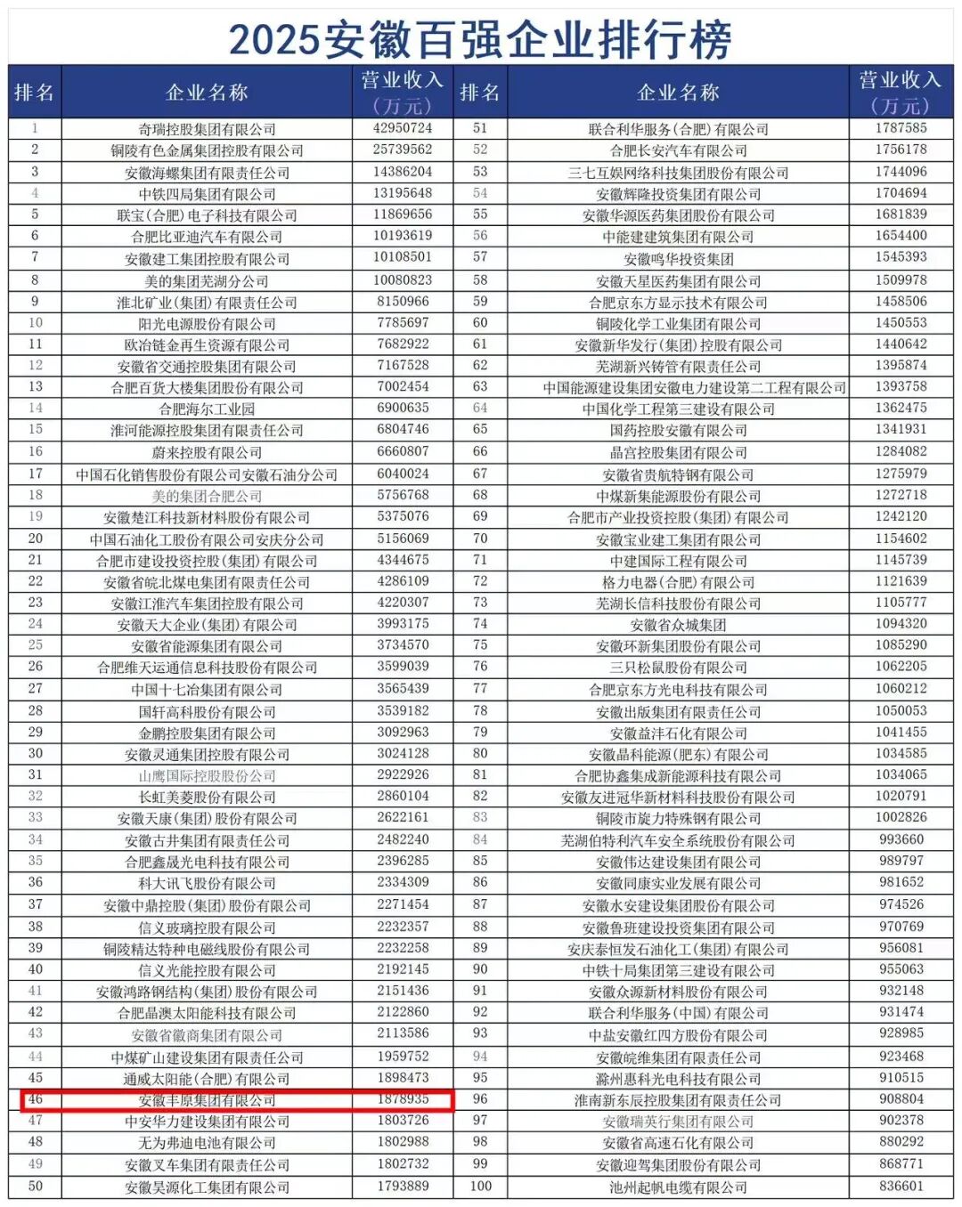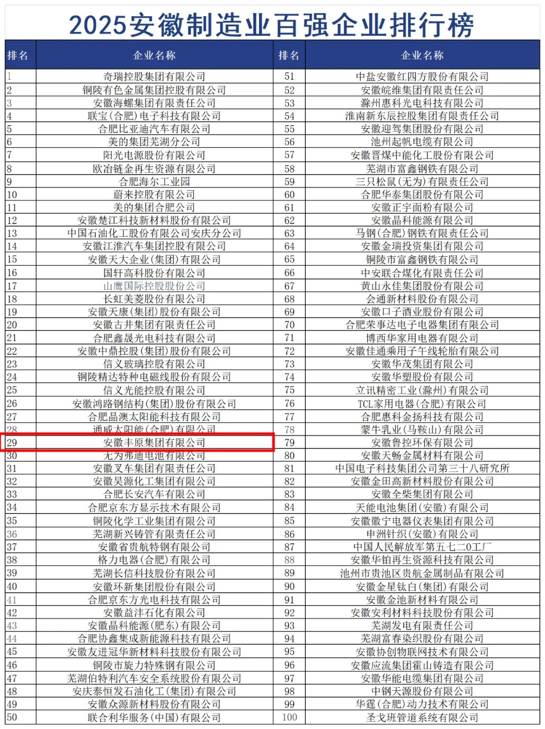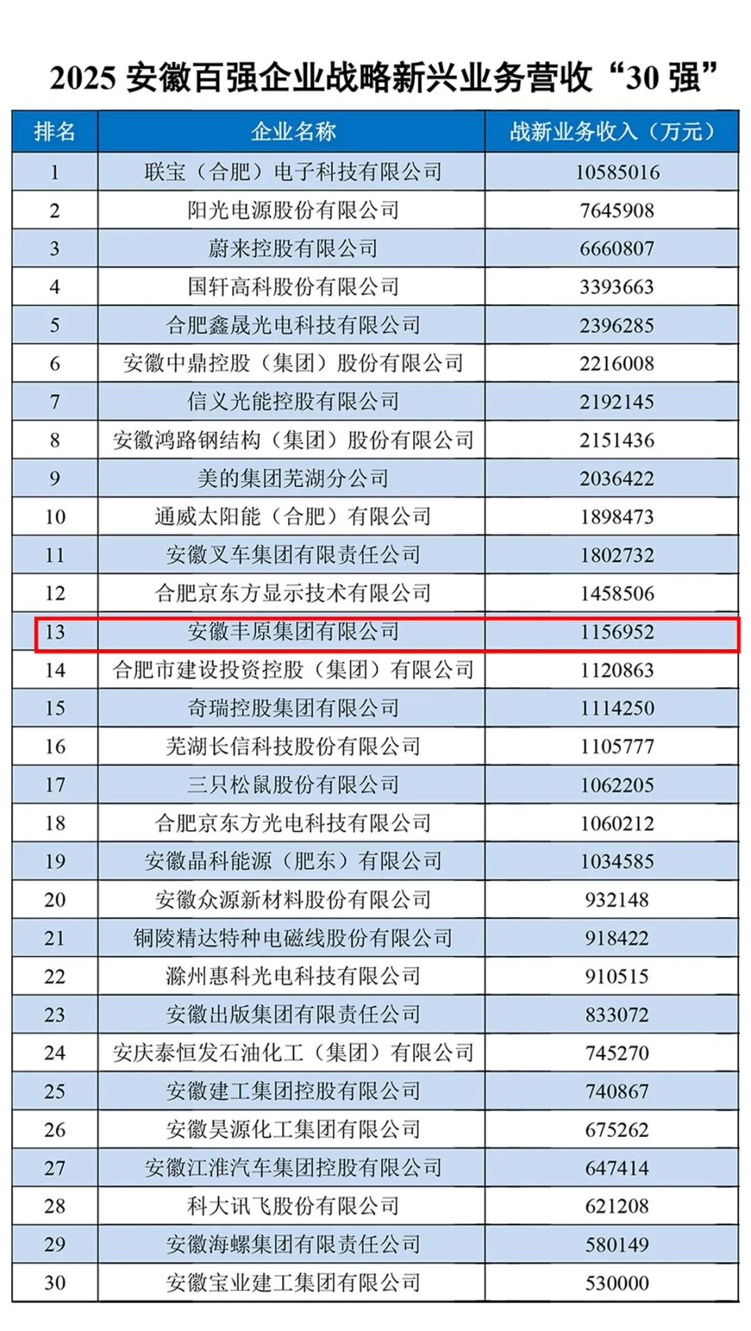 11月14日,2025安徽省百强企业发布会暨企业家论坛在合肥举行,会上发布了2025安徽百强企业、2025安徽制造业百强企业、2025安徽服务业百强企业、2025安徽百强企业战略新兴业务营收“30强”排行榜。丰原集团荣登“2025安徽百强企业”、“2025安徽制造业百强企业”和“2025安徽百强企业战略新兴业务营收“30强”榜单!