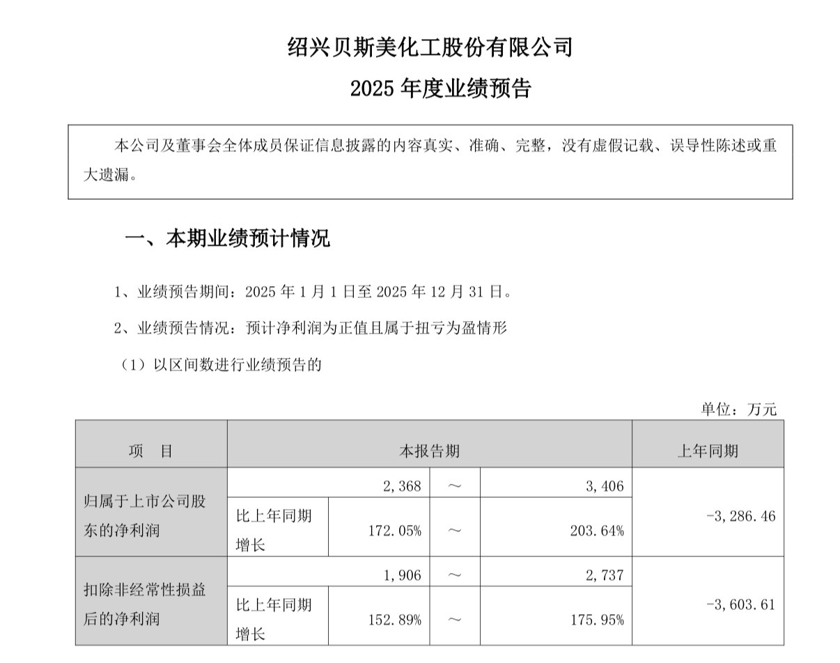 上证报中国证券网讯(记者 操子怡)1月15日晚,贝斯美(300796)发布业绩预告,预计2025年归母净利润为2368万元至3406万元,上年同期亏损3286.46万元;扣非归母净利润预计为1906万元至2737万元,上年同期亏损3603.61万元。